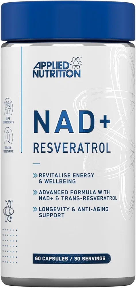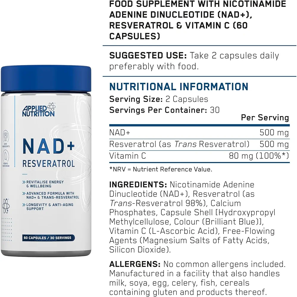 High Potency NAD+ and Resveratrol Formula – Each daily serving delivers 500mg NAD+ and 500mg Trans Resveratrol with 80mg Vitamin C to support cellular energy, vitality, and healthy aging. Designed for those who want to maintain natural energy and wellness.Supports Energy and Cellular Function – NAD+ plays a key role in energy metabolism and helps reduce tiredness and fatigue, providing natural daily energy support for active and health-conscious lifestyles.Antioxidant and Cellular Protection – Trans Resveratrol and Vitamin C provide powerful antioxidant support, helping protect cells from oxidative stress and contributing to overall cellular health and repair.Immune System and Longevity Support – Vitamin C supports normal immune system function, while NAD+ contributes to cellular repair and vitality, making this a natural longevity and wellness supplement.Vegan, Halal and UK Quality Assured – This resveratrol supplement is fully vegan and halal, free from common allergens, and manufactured in the UK in ISO 22000, BRC and GMP certified facilities for safety and trust. Convenient 30-Day Supply – Each bottle contains 60 vegan capsules, providing 30 servings for easy daily use. Simply take two capsules with food to support energy, immunity, and healthy aging every day.