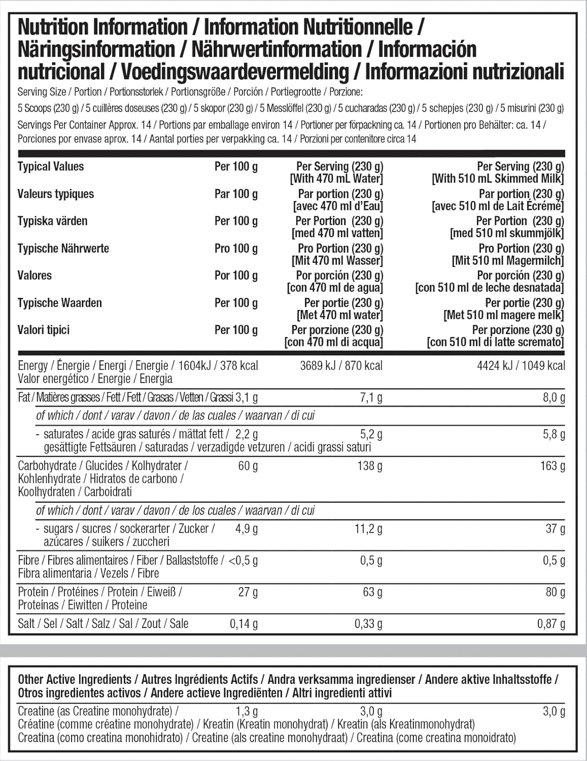 Provides 80 grams of protein, 163 grams of carbohydrates, 3 grams of creatine and over 1000 nutrient dense calories (with 510 ml of skim milk).