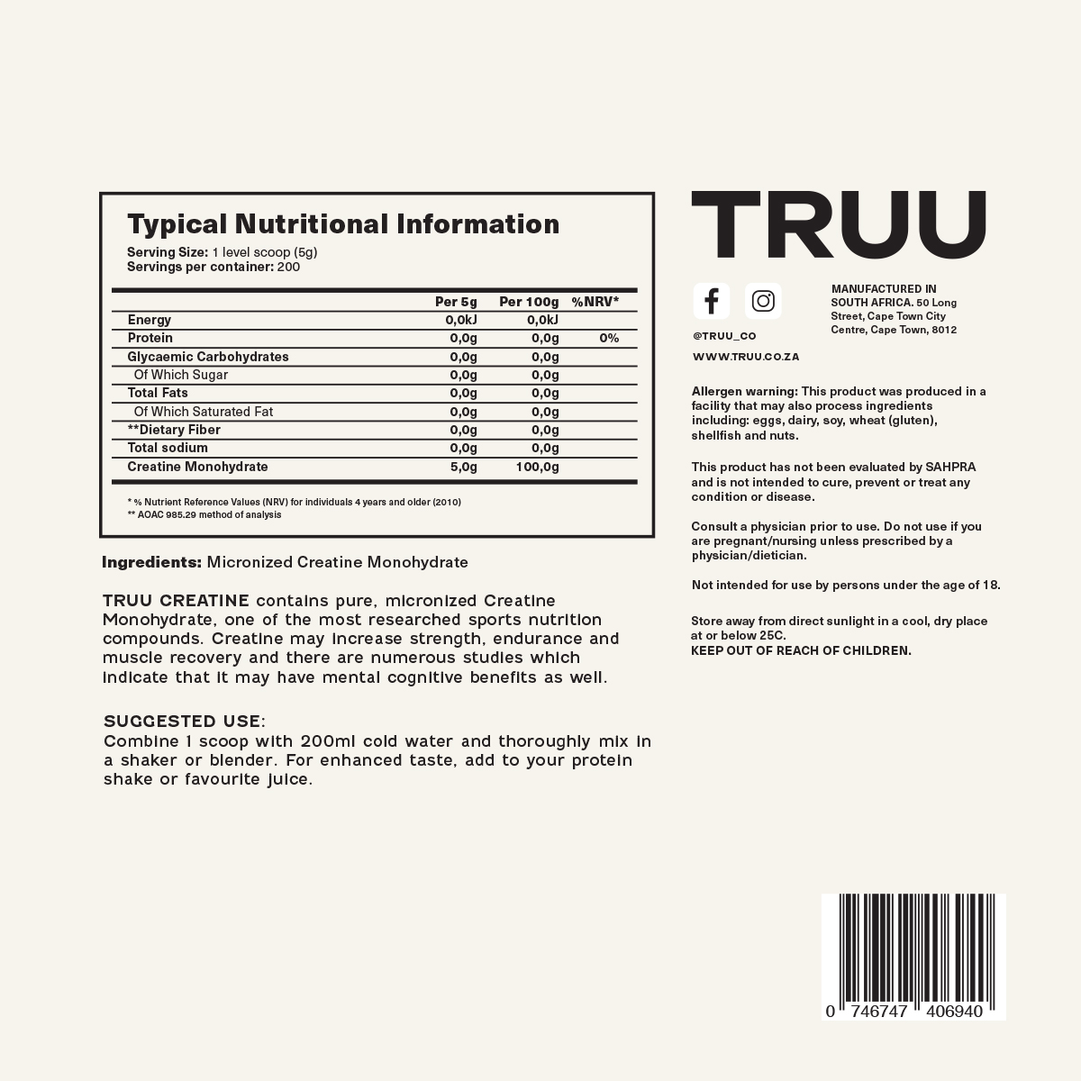 Description: TRUU CREATINE contains pure, micronized Creatine Monohydrate, one of the most researched sports nutrition compounds. Creatine may increase strength, endurance and muscle recovery and there are numerous studies which indicate that it may have mental cognitive benefits as well.
