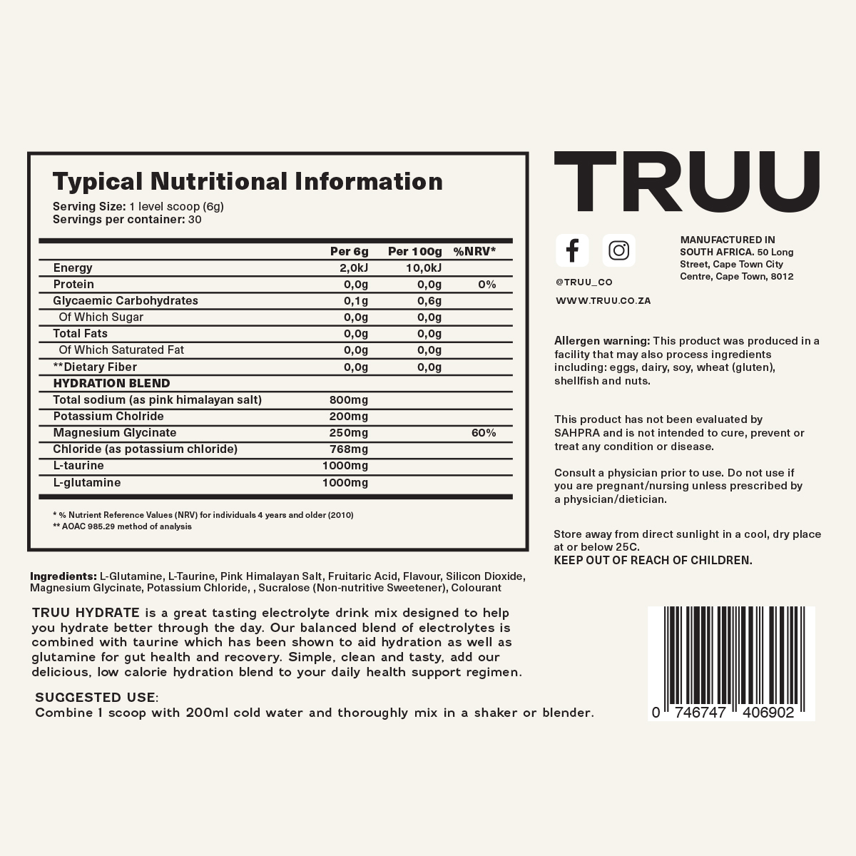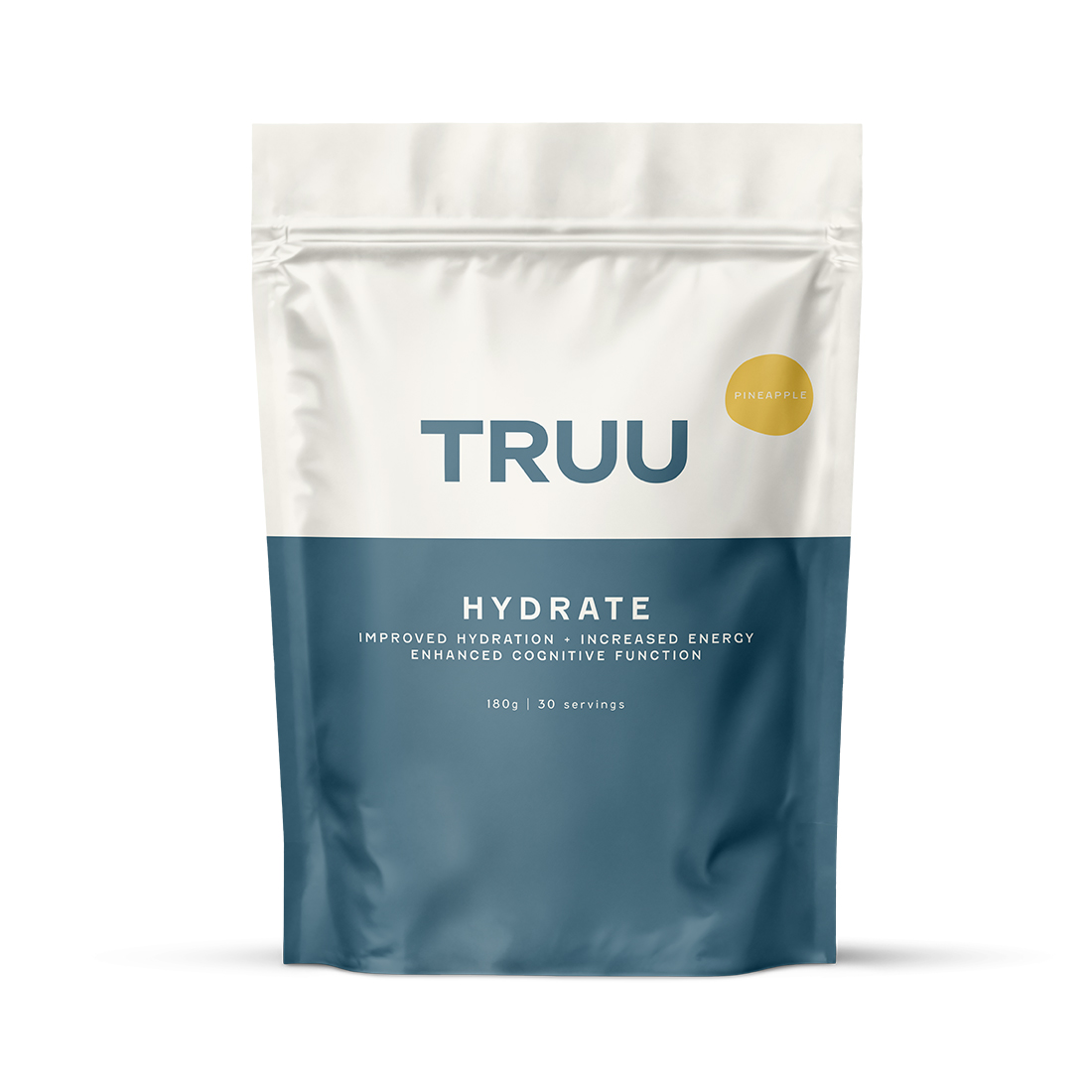 TRUU HYDRATE is a great tasting electrolyte drink mix designed to help you hydrate better through the day. Our balanced blend of electrolytes is combined with taurine which has been shown to aid hydration as well as glutamine for gut health and recovery. Simple, clean and tasty, add our delicious, low calorie hydration blend to your daily health support regimen.